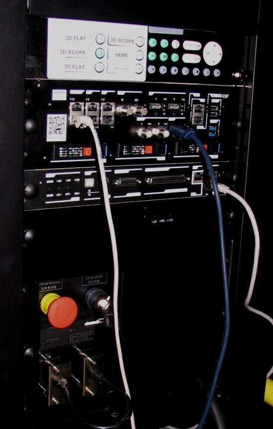 Pohled na samotný projektor Barco DP4K-60L. Zde mě trochu zradila 2D a perspektiva snímku. Odtah nevede z lamphouse laserového projektoru, ale původního Christie CP2000SB, který se ukrývá za Barcem.
