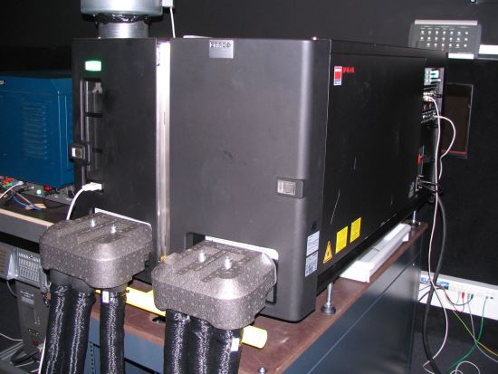 Porovnání původního lampového projektoru Christie CP2000SB (vlevo) a Barco DP4K-60L (vpravo). Levý projektor měl větší nevýhodu v podobě starší lampy s již pokleslým výkonem.