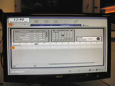 Pohled na displej ovládací konzole kinoserveru Dolby Show Player, ze které promítač ovládá samotné představení a kde má v playlistu nadefinovány i jednotlivé ukázky a reklamy před začátkem hlavního filmu.