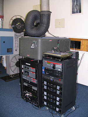 Pohled do projekční kabiny. Pod projektorem Christie CP2000-ZX vidíme v piedestalu kinoservery Dolby, satelitní přijímač a Blu-ray přehrávač. Vpravo pak vidíme zvukový rack s procesory Dolby CP650 a DTS XD10.