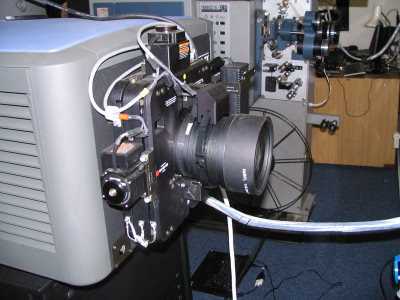 Objektiv Christie CP2000-ZX s automaticky nastavitelným motorovým zoomem pro změnu formátu promítaného filmu. Jelikož formát 2,35:1 – Cinemascope není na DCP zatím zaznamenáván anamorfně, musí se na širokoúhlé plátno ze základního 1,85:1 zoomovat.