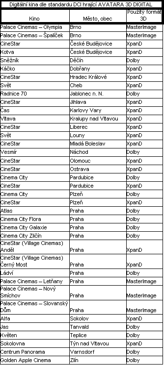 Avatar bude promítán v České republice na celkem 71 sálech. Jednom IMAXu ve 3D ze 70 mm filmového pásu, ve 25 kinech z 35 mm filmových kopií 2D a konečně 45 sálů vybavených digitální technologií standardu DCI s některým ze třech 3D stereoskopických systémů. Pro přehled uvádím kompletní tabulku všech českých kin a multiplexů kde bude Avatar 3D DIGITAL uveden v prvním distribučním týdnu.