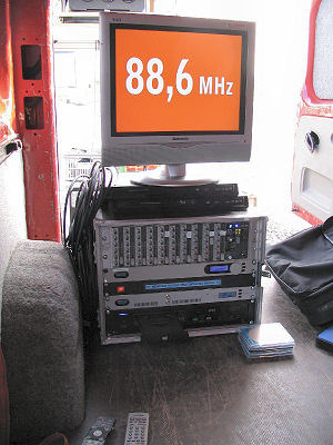 Režijní pracoviště v Autokině Fabia dodala na klíč, jako celé vybavení, firma AV Media. Na snímku vidíme celkem tři DVD přehrávače. Z prvního běžely reklamy a upoutávky a zbylé dva sloužili pro projekci filmu, druhý vždy jako záložní pro případný výpadek prvního. Na snímku dále vidíme LCD panel pro kontrolu projekce a FM vysílač.