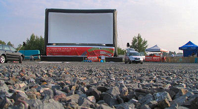 Nafukovací projekční plátno značky Airscreen o rozměrech projekční plochy 12×6 metrů používané v autokině Fabia.