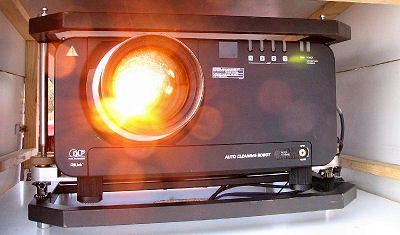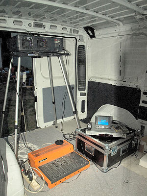Projekční kabina vytvořená z automobilu Citroen Jumper. Projektor zde byl použit Panasonic DW-5100E, ke kterému byl připojen stolní DVD přehrávač. Pro konktrolní nastavení projekce vidíme ještě malý LCD displej a zvuk zesiloval míchací pult s koncovým zesilovačem Tesla Studiomix.