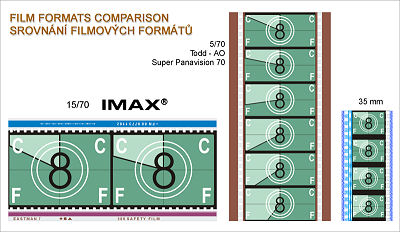Porovnání velikostí formátu IMAX 1570, 70 mm 570 formátu a klasického 35 mm filmového pásu. Zdroj obrázku: Wikipedia.org