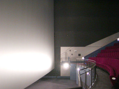 První řada a začátek plátna v IMAX Praha. Jasně je zřetelné, že spodní hrana plátna se nalézá několik metrů pod úrovní první řady. Foto: autor článku
