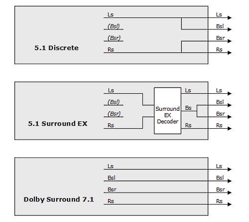 Je třeba též poznamenat, že systém Dolby Digital na 35mm filmu zmiňované další surroundové kanály nepodporuje, nicméně stále je možno vytvořit mix ve formátu Dolby Digital Surround EX z originálního Dolby Surround 7.1 mixu. Takový EX mix může být efektivně vyroben sloučením kanálů Bsl a Bsr, do EX kanálu zadního surroundu (Back Surround – Bs).