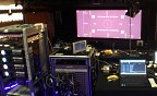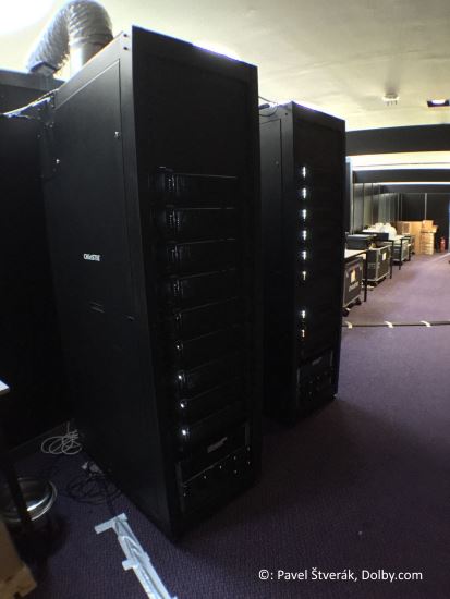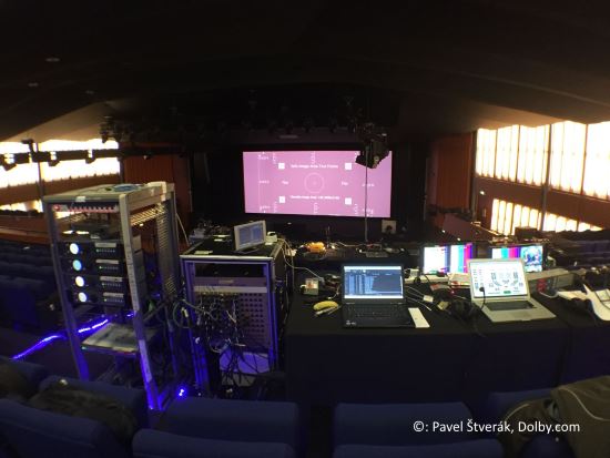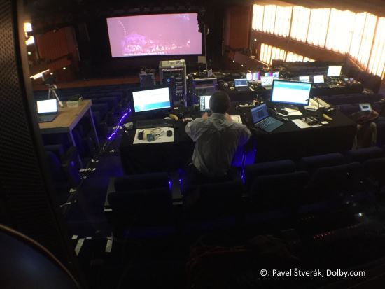 Kontrolní pracoviště Dolby. Na levo 4 x CP750 + 1x DMA8+ pro zpracování audia z různých zdrojů, včetně Dolby E, Dolby Digital a Dolby surround 7.1. Uprostřed laptop ovladající Dolby CP850 pro Dolby ATMOS. Napravo laptop na ovládání QSC Q-sys matrice.