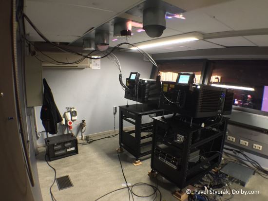 První snímek nás zavádí do projekční kabiny, ve které vidíme dvojici Christie 6p laserových projektorů. Znalejšího čtenáře asi zarazí absence tzv. odtahů pro chlazení projekční lampy. Místo lampy jsou do projektoru přivedena optická vlákna. Vidíme je připojené do lampové skříně na její zadní části. Dvojice projektorů je určena pro 3D projekci. Každý projektor promítá obraz pro jedno oko. Použit je systém Dolby 3D. Pod pravým projektorem je patrný zvukový procesor Dolby CP850 pro formát Dolby ATMOS.