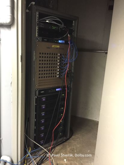 Zvukový rack osazený QSC Q-sys core a QSC 1644 zesilovači pro jednotlivé surroundy. Zvukový procesor Dolby CP850 posíla signál všech reproduktorů po ethernetu cat. 6 protokolem AES67 do řídící jednotky QSc Q-sys Core 500 (na obrazku hned nad zesilovači), kde se AES67 rozbočí do příslušných zesilovačů a následně do reproduktorů. Distribuce audia je skrze Q-sys network: z Core 500 jednotky do racků po cat 6, a az teprve v racku se z cat 6. signalu stane analog v distribucni jednotce Q-sys IO-Frame (na obrázku úplně nahoře, hned pod síťovým switchem).