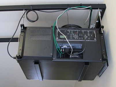 Projektor NEC NC800C používaný v prezentační místnosti. Návštěvník prakticky vidí, že lze tento model regulérně instalovat i jako zavěšený na stropě. Foto: autor článku