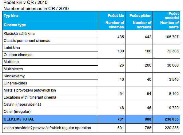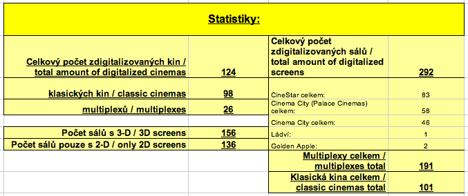 První je počet kin ze zdrojů UFD a MKČR z konce roku 2010, ve které se toho za rok 2011 moc nezměnilo, pouze zavřelo pár menších klasických kin. Druhý obrázek je z naší statistiky digitálních kin k 5.12.2011.