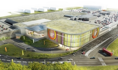 Vizualizace nové části obchodního centra Černý Most s objektem nového multiplexu v popředí. Zdroj obrázku: centrumcernymost.cz