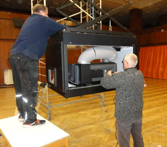 Box na projektor v Hodoníně v manipulační pozici pro údržbu projekoru. Zdroj obrázku Dcinema s.r.o., Ing Jiří Šamonil