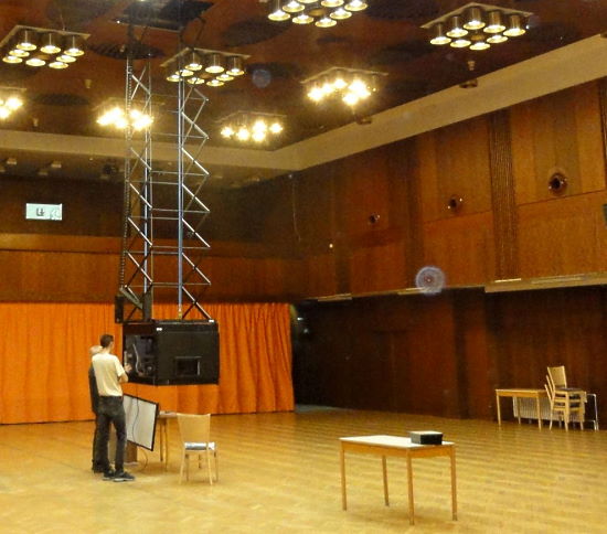 Nejoriginálnějším řešením je pak umístění samotného projektoru NEC NC1000 s integrovaným mediablokem jako kinoserverem. Ten je umístěn v odhlučněném boxu, jaké známe třeba z pražského kina Pilotů. Ten v Hodoníně je ale zavěšen na speciálním nůžkovém závěsu, který umožňuje s projektorem vertikální pohyb v rozsahu 7 metrů. U stropu je v pozici pro projekci a v případě potřeby servisu během několika málo minut sjede asi do výšky jednoho metru nad podlahou, takže se dá snadno servisovat. Například vyčištění filtrů nebo výměna lampy.