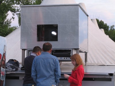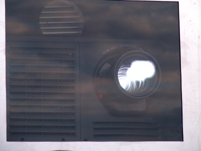 Projektor ukrytý v ochranném hliníkovém boxu s kinoserverem a zvukovými zesilovači. Myčka nádobí se nalézá v objektu pod projektorem a oblaka páry jsou v nepravidelných intervalech vypouštěna škvírou na úrovni ruky slečny v červeném kostýmku. Uklidnění pro diváky. Během představení se nádobí již nemyje. 🙂