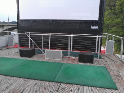 Promítá se na 5,5 metrů široké nafukovací plátno značky Airscreen. Zvuk je také uzpůsoben podmínkám na lodi. Pod plátnem jsou instalovány 3.1 venkovní reproduktory JBL napojené na dva koncové zesilovače Crown DSi 2000 s tím, že zadní surroundy jsou zapojeny na přední levý a pravý kanál.