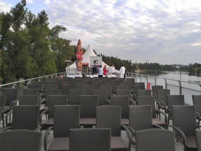 Ale nyní už k samotnému Kinu na lodi. To je vybaveno zapůjčenou technikou standardu DCI od integrátorské společnosti, AV MEDIA, kterou tvoří projektor Christie CP2210 propojený přes Media blok IMB s diskovým polem Doremi Show Vault. Projektor se serverem i zvukovým řetězcem je ukryt ve speciálním hliníkovém boxu s projekčním oknem, který jej chrání před deštěm, větrem, blesky i výpary z palubní myčky nádobí, jež je umístěna přímo pod ním. Na každé lodi byly vždy bojové podmínky. 🙂