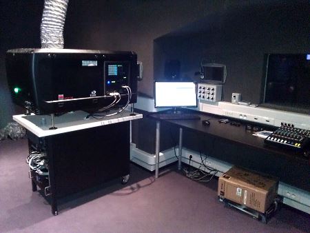 Projekční kabina malého sálu s projektorem Barco DP2K-23B. 35 mm filmové projektory už zde budeme hledat marně.