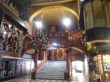 Slavné schodiště do kina Lucerna. Když se podíváte na kazetový strop nad schodištěm, tak přesně nad ním se skrývá staronový malý sál.