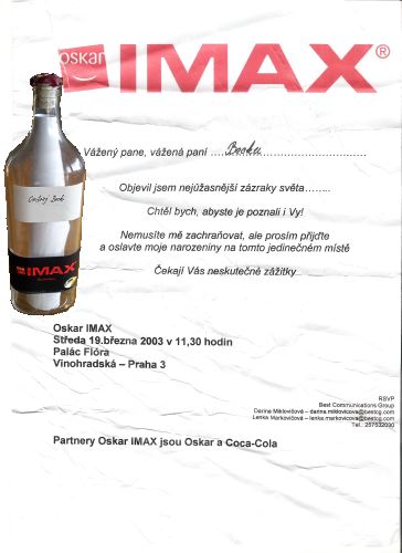 Pozvánka na slavnostní zahájení kina IMAX Praha z 19. března 2003. Pozvánka přišla srolovaná a zapečetěná v lahvi jako zpráva od trosečníka. Foto: autor článku