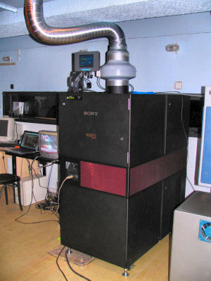 Otevřená zadní část projektoru. Nahoře Sony kinoserver LMT 200 a uprostřed SMS server HP a dole záložní zdroj APC.