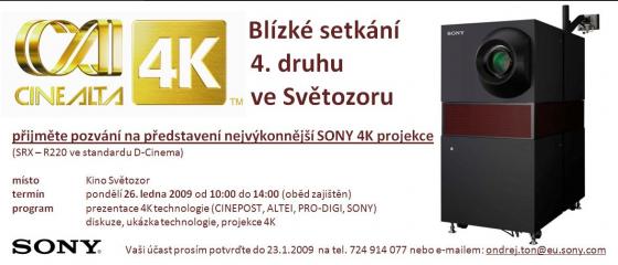 26.1.2009 proběhla v kině Světozor předváděcí projekce Sony 4K řešení pro kina. Byla to třetí a pravděpodobně poslední prezentace, neboť DEMO projektor bude muset zpět do Londýna. Včerejší prezentace byla co do návštěvnosti největší. Dorazilo cca 70 návštěvníků, kteří měli možnost vidět něco, co nikdo z předchozích. Čtyřminutová ukázka z filmu Tobruk ve 4K, tedy v rozlišení, ve kterém ještě žádný český film nebyl digitálně promítán. Společnost Cinepost, která ukázku připravila tak jasně dala nejevo, že to s digitálním masteringem pro kina myslí vážně.