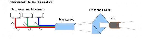 Ilustrační obrázek: Schéma RGB laserového projektoru Barco. Zdroj: Barco.com